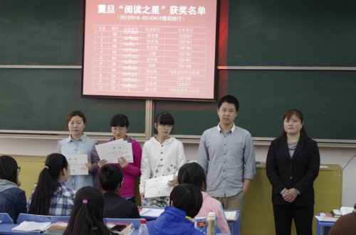 随后,图书馆揭晓了借阅图书排名前十的同学名单,其中12国商1班的段青霞同学以50本的数量荣登榜首;图书馆“那些感动我们的书”征文评选的结果也在会上公布,13会计1班的刘仕渊与付杰凤同学、13表演班的樊文艺同学获得优秀奖,另有6位同学分获参与奖。图书馆蒋馆长与流通部洪老师分别为各位获奖同学颁发了奖状与奖品。